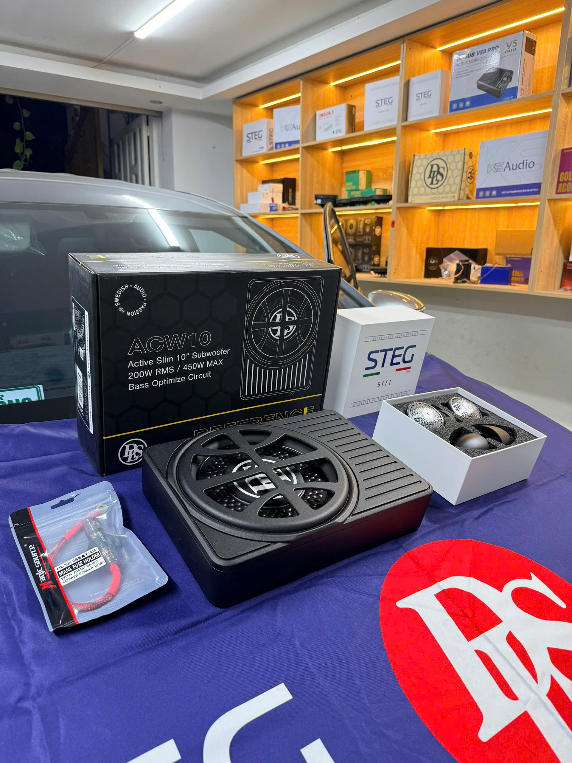 Loa sub điện là bộ phận tái tạo dải âm trầm - siêu trầm trong hệ thống âm thanh xe hơi. Loa sub điện gồm 1 loa subwoofer và 1 ampli tích hợp sẵn, được đóng trong thùng. Đường kính loa sub điện ô tô  thường là 8 hoặc 10 inch. Các dòng loa sub điện trên thị trường thường có công suất RMS khoảng 150 Watts, công suất Max khoảng 400 Watts. Nhờ tích hợp sẵn cùng ampli trong thùng nên 1 bộ loa sub điện có kích thước nhỏ gọn, dễ lắp đặt. Loa sub điện tường được lắp ở dưới ghế phụ hoặc chỗ để chân ghế phụ. Chiếc xe (xe) trong bài viết sử dụng loa sub điện DLS ACW10, đường kính loa sub 10 inch, công suất RMS 200W.