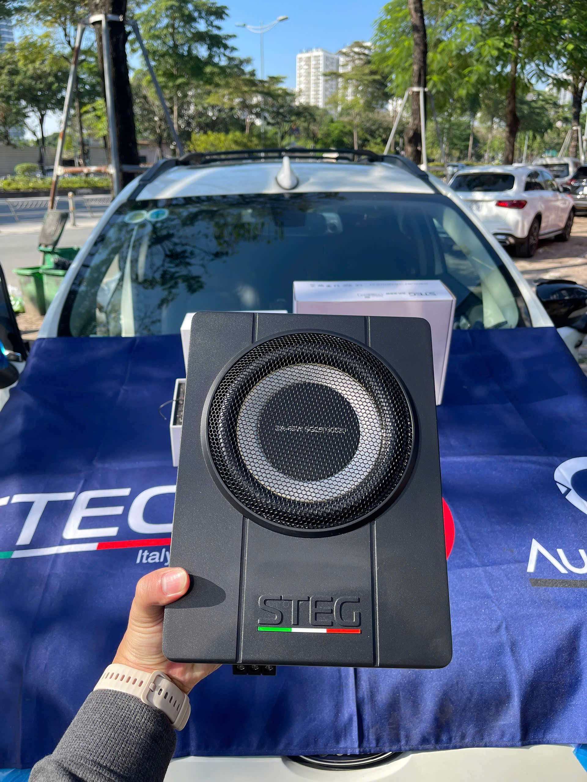 Loa sub điện là bộ phận tái tạo dải âm trầm - siêu trầm trong hệ thống âm thanh xe hơi. Loa sub điện gồm 1 loa subwoofer và 1 ampli tích hợp sẵn, được đóng trong thùng. Đường kính loa sub điện ô tô thường là 8 hoặc 10 inch. Các dòng loa sub điện trên thị trường thường có công suất RMS khoảng 150 Watts, công suất Max khoảng 400 Watts. Nhờ tích hợp sẵn cùng ampli trong thùng nên 1 bộ loa sub điện có kích thước nhỏ gọn, dễ lắp đặt. Loa sub điện tường được lắp ở dưới ghế phụ hoặc chỗ để chân ghế phụ. Chiếc xe (xe) trong bài viết sử dụng loa sub điện STEG SW65, đường kính loa sub 8 inch, công suất RMS 200W.