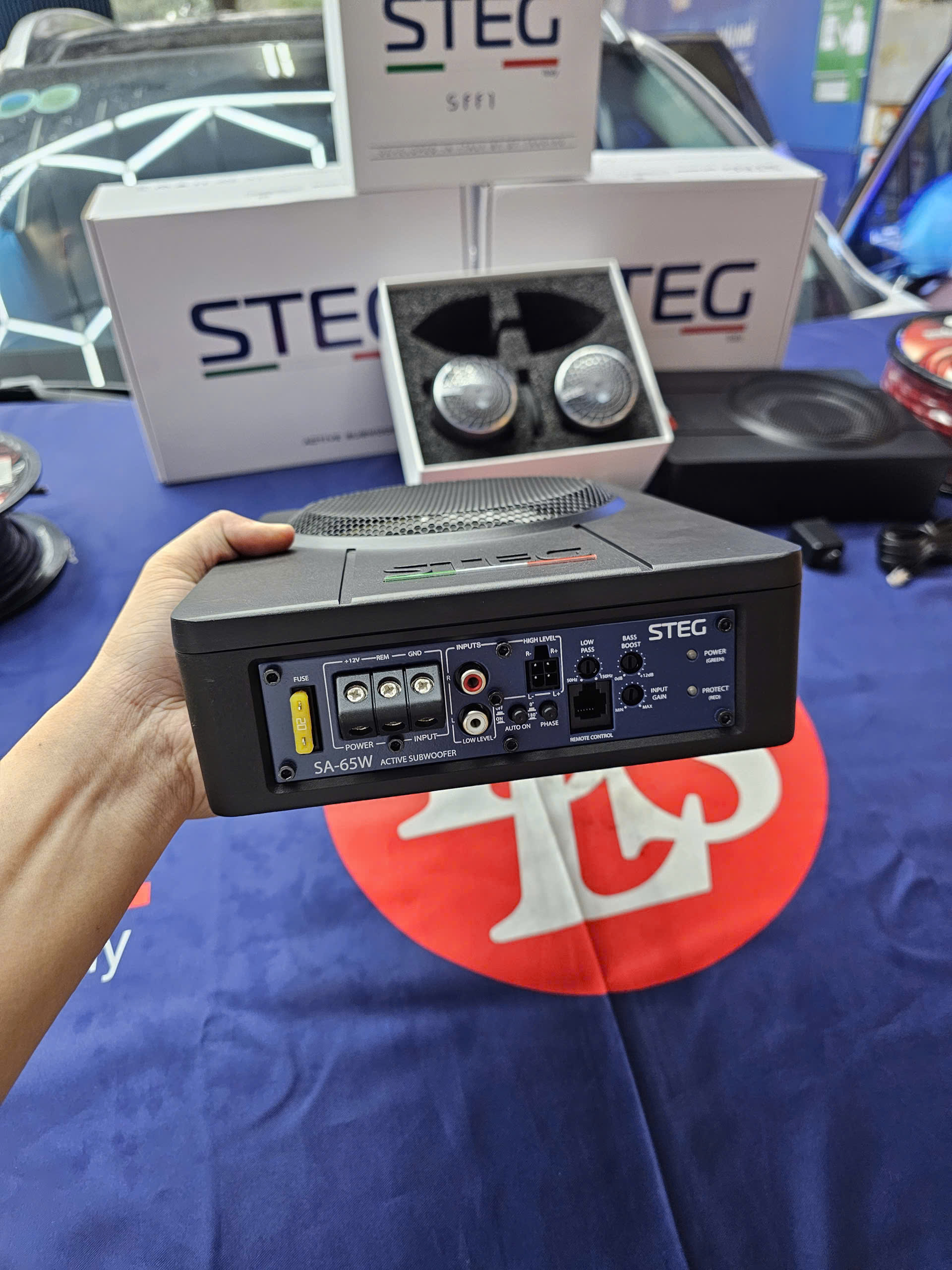 Loa sub điện là bộ phận tái tạo dải âm trầm - siêu trầm trong hệ thống âm thanh xe hơi. Loa sub điện gồm 1 loa subwoofer và 1 ampli tích hợp sẵn, được đóng trong thùng. Đường kính loa sub điện ô tô thường là 8 hoặc 10 inch. Các dòng loa sub điện trên thị trường thường có công suất RMS khoảng 150 Watts, công suất Max khoảng 400 Watts. Nhờ tích hợp sẵn cùng ampli trong thùng nên 1 bộ loa sub điện có kích thước nhỏ gọn, dễ lắp đặt. Loa sub điện tường được lắp ở dưới ghế phụ hoặc chỗ để chân ghế phụ. Chiếc xe (xe) trong bài viết sử dụng loa sub điện STEG SW65, đường kính loa sub 10 inch, công suất RMS 200W.