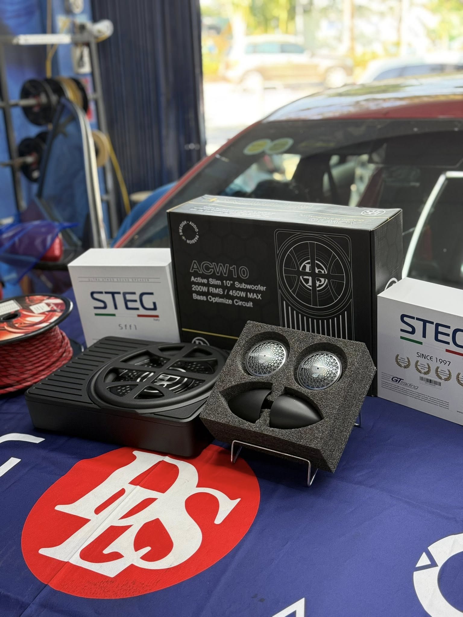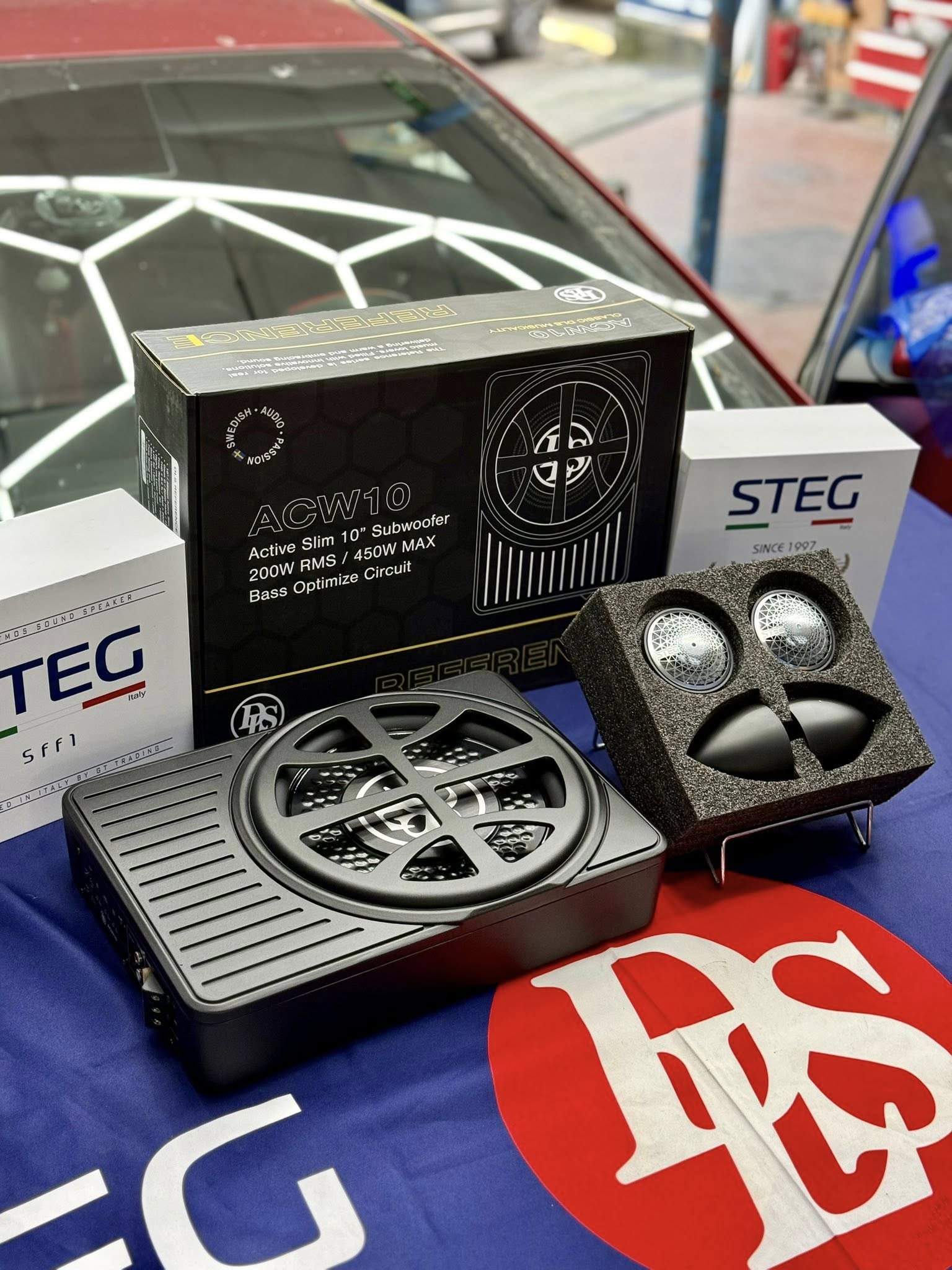 Loa sub điện là bộ phận tái tạo dải âm trầm - siêu trầm trong hệ thống âm thanh xe hơi. Loa sub điện gồm 1 loa subwoofer và 1 ampli tích hợp sẵn, được đóng trong thùng. Đường kính loa sub điện ô tô thường là 8 hoặc 10 inch. Các dòng loa sub điện trên thị trường thường có công suất RMS khoảng 150 Watts, công suất Max khoảng 400 Watts. Nhờ tích hợp sẵn cùng ampli trong thùng nên 1 bộ loa sub điện có kích thước nhỏ gọn, dễ lắp đặt. Loa sub điện tường được lắp ở dưới ghế phụ hoặc chỗ để chân ghế phụ. Chiếc xe (xe) trong bài viết sử dụng loa sub điện DLS ACW10, đường kính loa sub 10 inch, công suất RMS 200W.