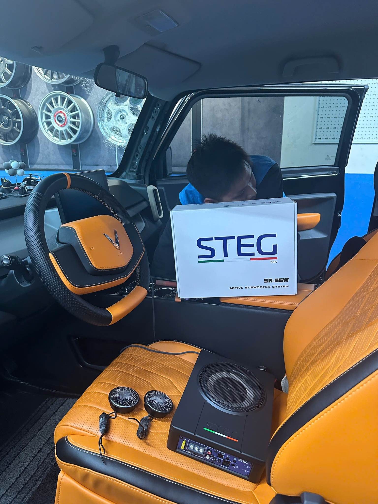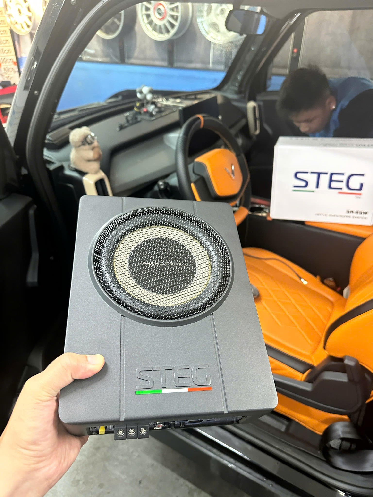 Loa sub điện là bộ phận tái tạo dải âm trầm - siêu trầm trong hệ thống âm thanh xe hơi. Loa sub điện gồm 1 loa subwoofer và 1 ampli tích hợp sẵn, được đóng trong thùng. Đường kính loa sub điện ô tô thường là 8 hoặc 10 inch. Các dòng loa sub điện trên thị trường thường có công suất RMS khoảng 150 Watts, công suất Max khoảng 400 Watts. Nhờ tích hợp sẵn cùng ampli trong thùng nên 1 bộ loa sub điện có kích thước nhỏ gọn, dễ lắp đặt. Loa sub điện tường được lắp ở dưới ghế phụ hoặc chỗ để chân ghế phụ. Chiếc xe (xe) trong bài viết sử dụng loa sub điện STEG SA65W, đường kính loa sub 10 inch, công suất RMS 200W.