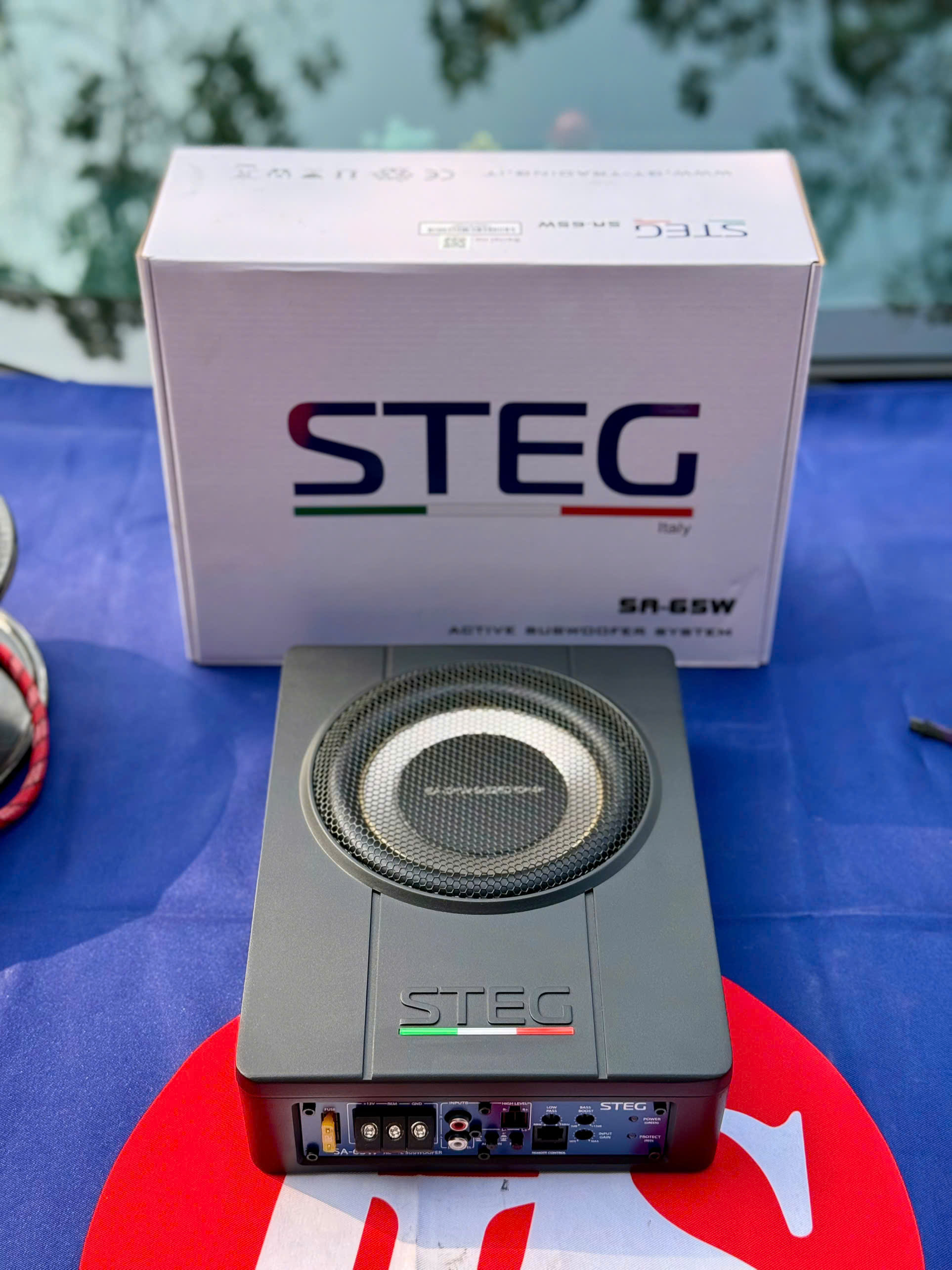 Loa sub điện là bộ phận tái tạo dải âm trầm - siêu trầm trong hệ thống âm thanh xe hơi. Loa sub điện gồm 1 loa subwoofer và 1 ampli tích hợp sẵn, được đóng trong thùng. Đường kính loa sub điện ô tô thường là 8 hoặc 10 inch. Các dòng loa sub điện trên thị trường thường có công suất RMS khoảng 150 Watts, công suất Max khoảng 400 Watts. Nhờ tích hợp sẵn cùng ampli trong thùng nên 1 bộ loa sub điện có kích thước nhỏ gọn, dễ lắp đặt. Loa sub điện tường được lắp ở dưới ghế phụ hoặc chỗ để chân ghế phụ. Chiếc xe (xe) trong bài viết sử dụng loa sub điện STEG SW65, đường kính loa sub 8 inch, công suất RMS 200W.