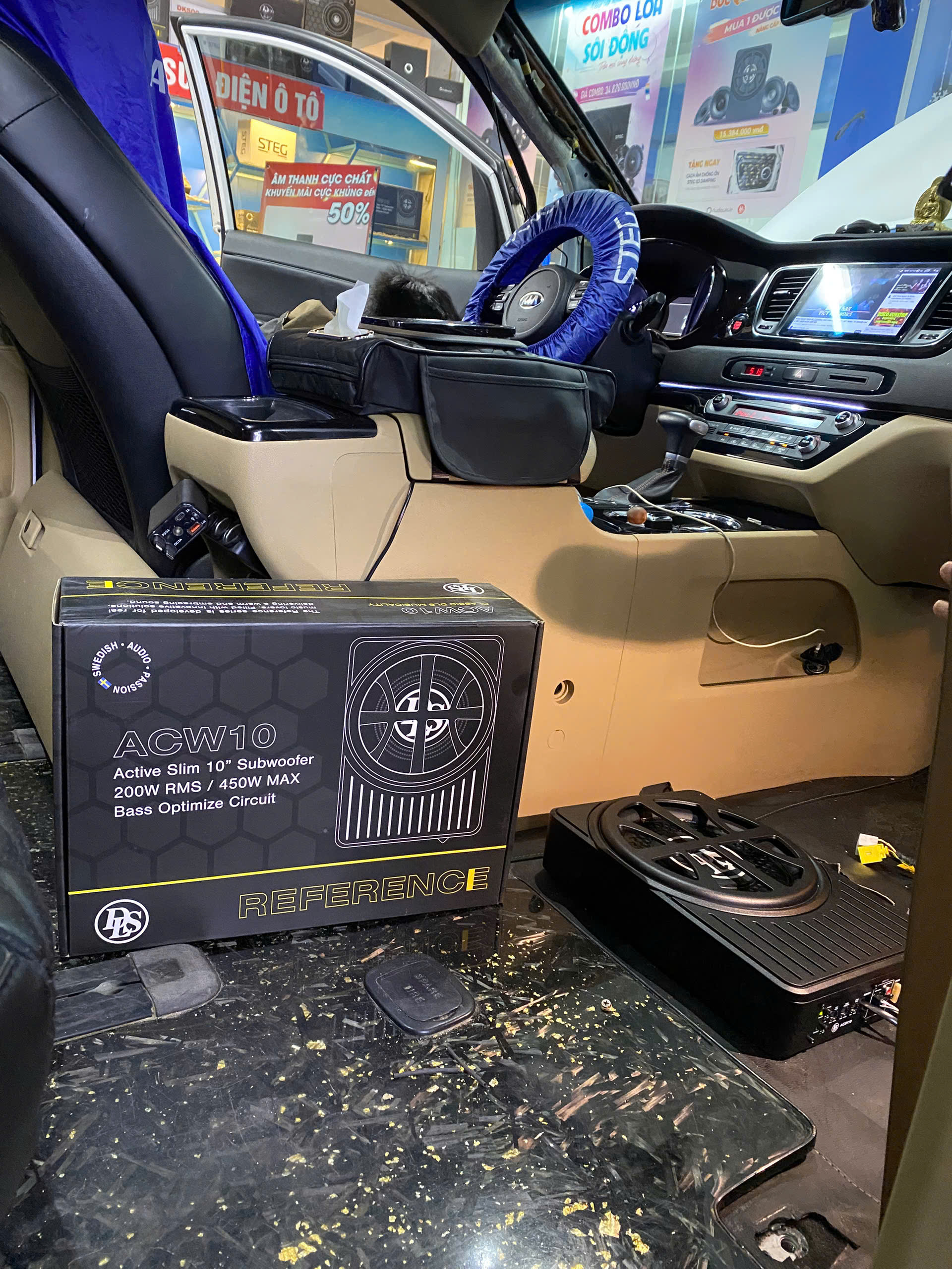 Loa sub điện là bộ phận tái tạo dải âm trầm - siêu trầm trong hệ thống âm thanh xe hơi. Loa sub điện gồm 1 loa subwoofer và 1 ampli tích hợp sẵn, được đóng trong thùng. Đường kính loa sub điện ô tô thường là 8 hoặc 10 inch. Các dòng loa sub điện trên thị trường thường có công suất RMS khoảng 150 Watts, công suất Max khoảng 400 Watts. Nhờ tích hợp sẵn cùng ampli trong thùng nên 1 bộ loa sub điện có kích thước nhỏ gọn, dễ lắp đặt. Loa sub điện tường được lắp ở dưới ghế phụ hoặc chỗ để chân ghế phụ. Chiếc xe (xe) trong bài viết sử dụng loa sub điện DLS ACW10, đường kính loa sub 10 inch, công suất RMS 200W.