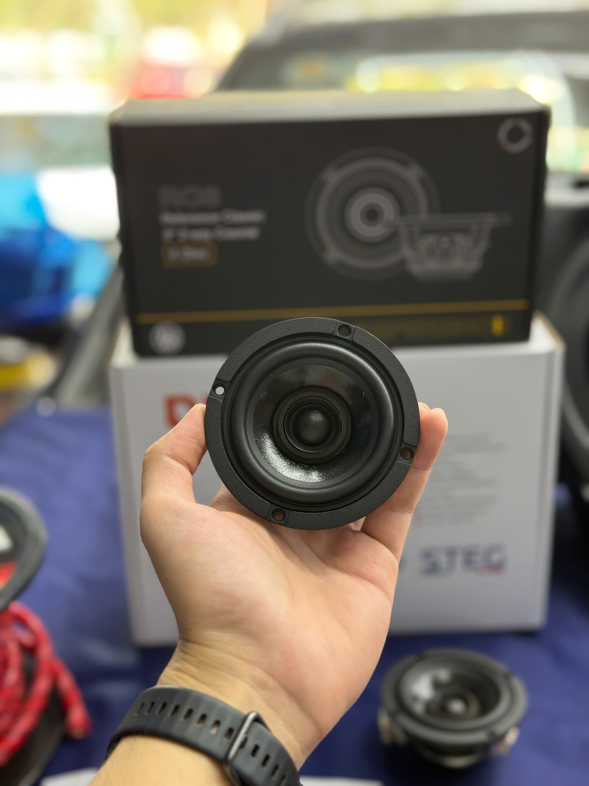 Sở thích của chủ xe chú trọng vào dải âm bass do đây là phần nền của nhiều bài nhạc. Âm bass có chiều sâu, đánh có lực thì tổng thể mới hay. Vì vậy, anh chọn loa sub hơi ô tô DLS RCW10 để ghép nối trong cấu hình. Loa sub hơi STEG SQ8 - 2 SE có đường kính 10 inch, với màng loa làm bằng nhôm, tổng thể cho công suất RMS 300 Watts. Đặc biệt, tuy có công suất rất cao nhưng thiết kế của loa sub lại rất gọn, yêu cầu thể tích thùng loa chỉ khoảng 15 - 18 lít.