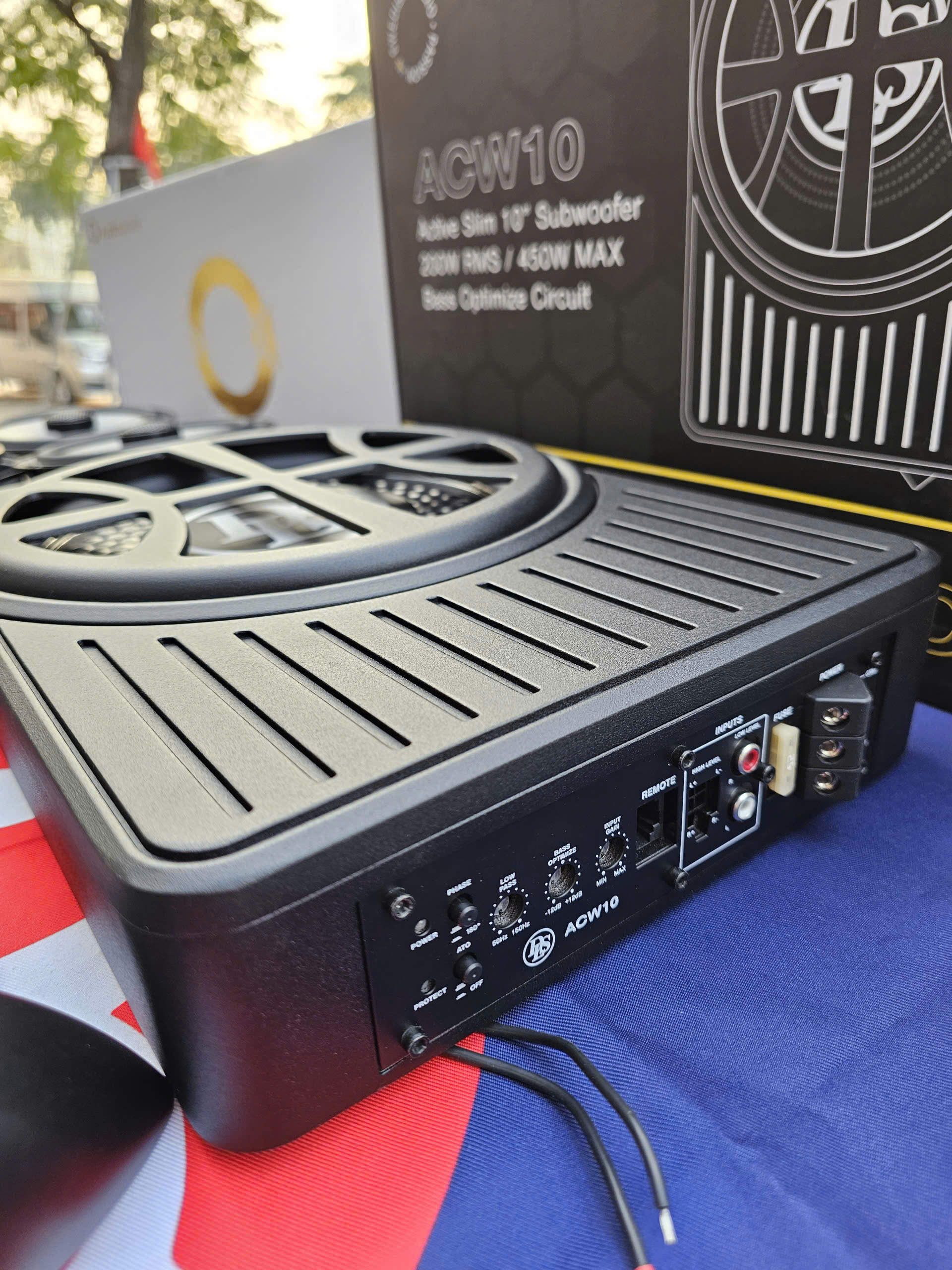 Loa sub điện là bộ phận tái tạo dải âm trầm - siêu trầm trong hệ thống âm thanh xe hơi. Loa sub điện gồm 1 loa subwoofer và 1 ampli tích hợp sẵn, được đóng trong thùng. Đường kính loa sub điện ô tô thường là 8 hoặc 10 inch. Các dòng loa sub điện trên thị trường thường có công suất RMS khoảng 150 Watts, công suất Max khoảng 400 Watts. Nhờ tích hợp sẵn cùng ampli trong thùng nên 1 bộ loa sub điện có kích thước nhỏ gọn, dễ lắp đặt. Loa sub điện tường được lắp ở dưới ghế phụ hoặc chỗ để chân ghế phụ. Chiếc xe Toyota Hilux trong bài viết sử dụng loa sub điện DLS ACW10, đường kính loa sub 10 inch, công suất RMS 200W.