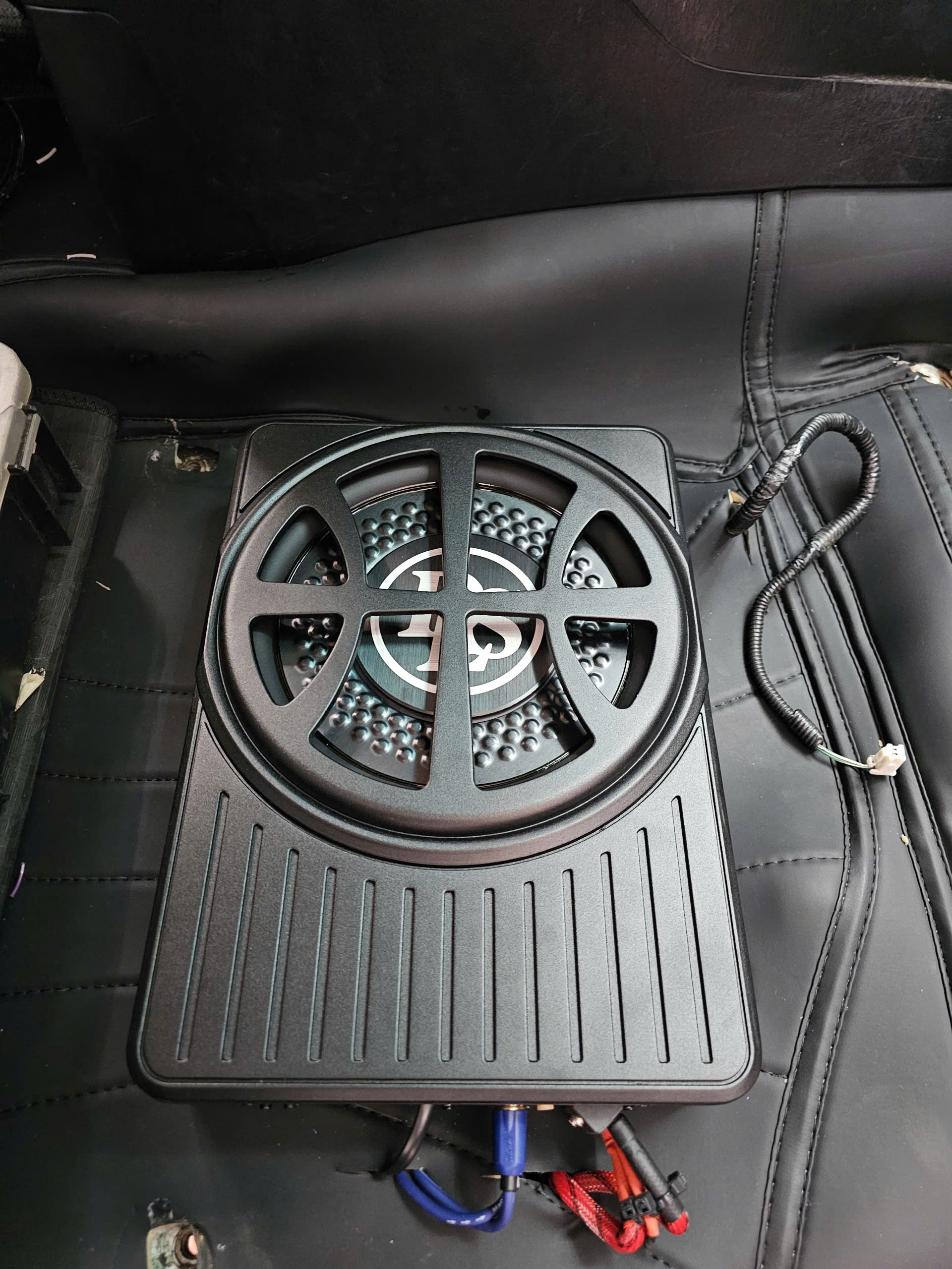 Loa sub điện là bộ phận tái tạo dải âm trầm - siêu trầm trong hệ thống âm thanh xe hơi. Loa sub điện gồm 1 loa subwoofer và 1 ampli tích hợp sẵn, được đóng trong thùng. Đường kính loa sub điện ô tô thường là 8 hoặc 10 inch. Các dòng loa sub điện trên thị trường thường có công suất RMS khoảng 150 Watts, công suất Max khoảng 400 Watts. Nhờ tích hợp sẵn cùng ampli trong thùng nên 1 bộ loa sub điện có kích thước nhỏ gọn, dễ lắp đặt. Loa sub điện tường được lắp ở dưới ghế phụ hoặc chỗ để chân ghế phụ. Chiếc xe Toyota Fortuner trong bài viết sử dụng loa sub điện Thụy Điển DLS ACW10, đường kính loa sub 10 inch, công suất RMS 200W.