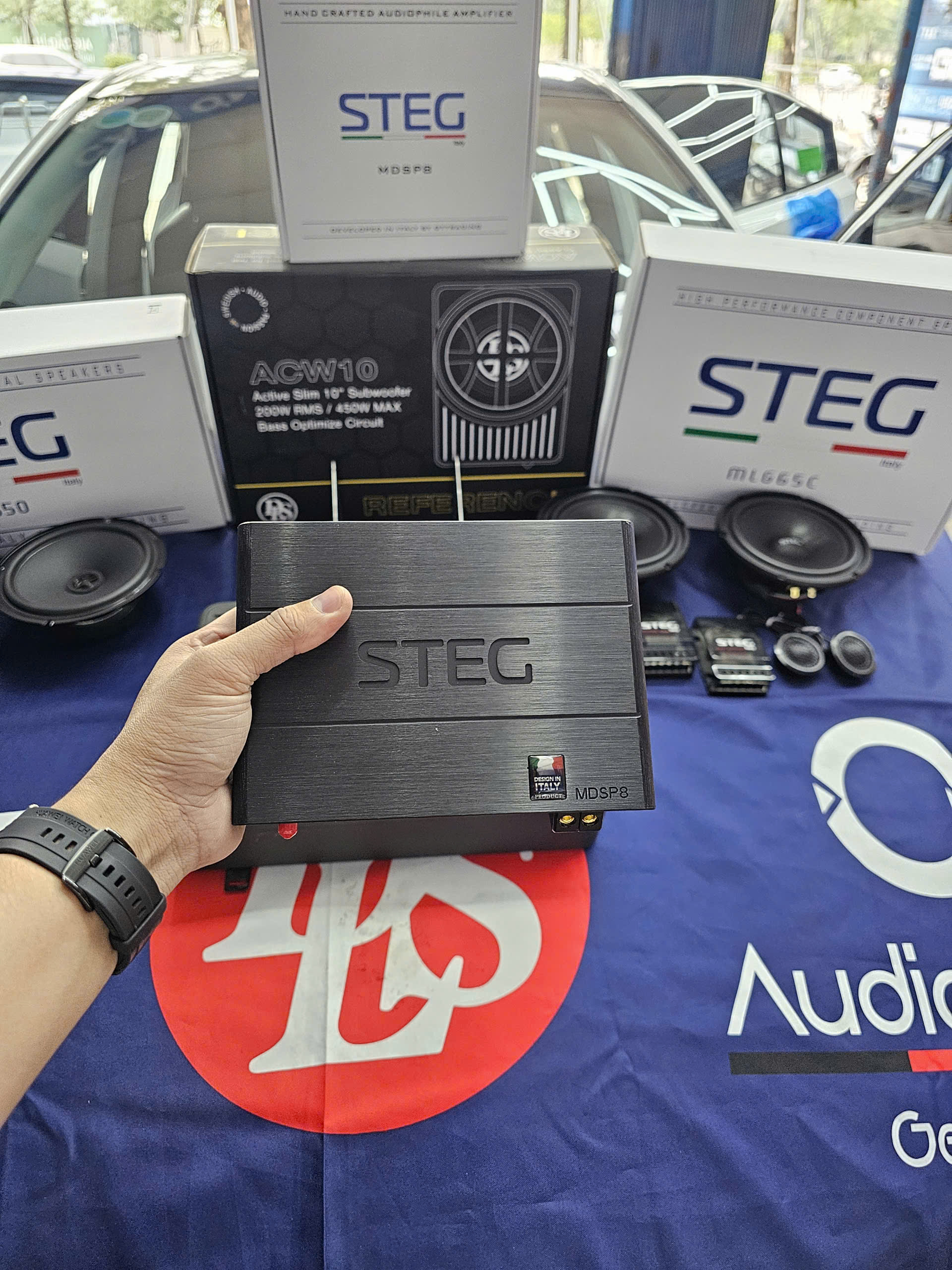 Chủ xe Toyota Altis chọn ampli tích hợp DSP dòng STEG MDSP8. Ngoài chức năng chính là kéo công suất cho loa cánh, MDSP8 còn giúp người dùng căn chỉnh hệ thống âm thanh như độ cân bằng, độ trễ. Từ đó mang đến trải nghiệm âm thanh chính xác hơn.