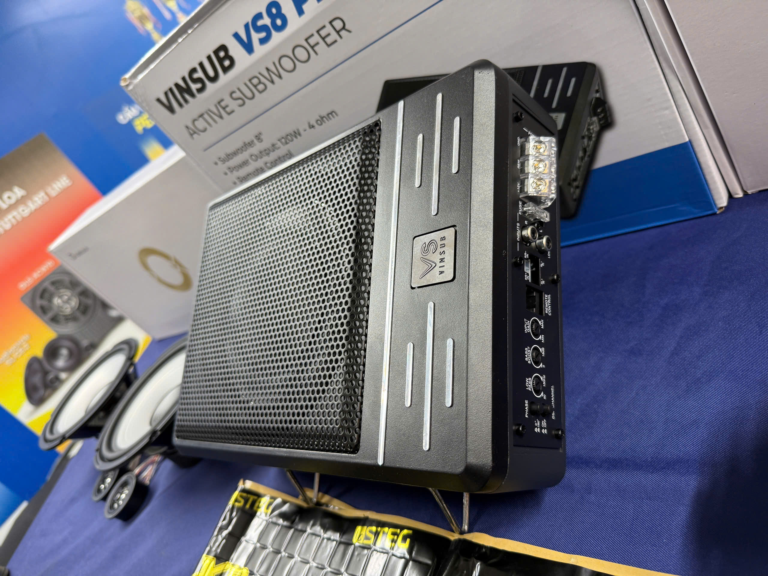 Loa sub điện là bộ phận tái tạo dải âm trầm - siêu trầm trong hệ thống âm thanh xe hơi. Loa sub điện gồm 1 loa subwoofer và 1 ampli tích hợp sẵn, được đóng trong thùng. Đường kính loa sub điện ô tô thường là 8 hoặc 10 inch. Các dòng loa sub điện trên thị trường thường có công suất RMS khoảng 150 Watts, công suất Max khoảng 400 Watts. Nhờ tích hợp sẵn cùng ampli trong thùng nên 1 bộ loa sub điện có kích thước nhỏ gọn, dễ lắp đặt. Loa sub điện tường được lắp ở dưới ghế phụ hoặc chỗ để chân ghế phụ. Chiếc xe Mitsubishi Pajero Sport trong bài viết sử dụng loa sub điện VinsubVS8 Pro, đường kính loa sub 10 inch, công suất RMS 200W.